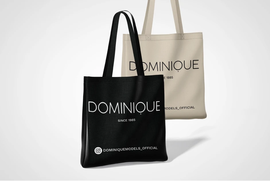 Réalisation de merchandising pour la marque Dominique : production de tote bags personnalisés, pensés comme supports de communication élégants et durables, associant utilité et valorisation de l’identité de la marque.