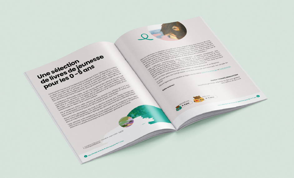 La conception graphique s’appuie sur un univers coloré et expressif, pensé pour refléter la richesse de la littérature jeunesse. Jeux de formes, palettes vibrantes et compositions rythmées créent un parcours de lecture fluide et vivant. Chaque double page devient un espace d’exploration où les ouvrages sont mis en valeur avec clarté, tout en conservant une dimension ludique qui évoque l’imaginaire propre à l’enfance.