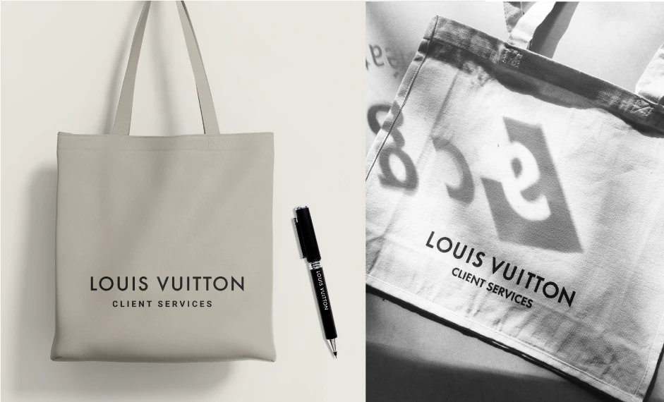 Réalisation de merchandising pour Louis Vuitton : production de tote bags et stylos personnalisés, conçus comme supports de communication élégants et qualitatifs.